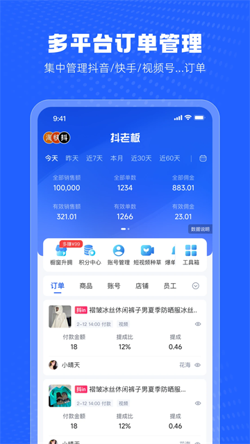 2.订单管理与分析:实时同步抖音/快手等多平台分销订单,并提供各维度排行与收益分析