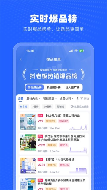 3、商品筛选:选择多项条件即可筛选查找想要的爆品商品,从而能够得到全新的商品进行带货;