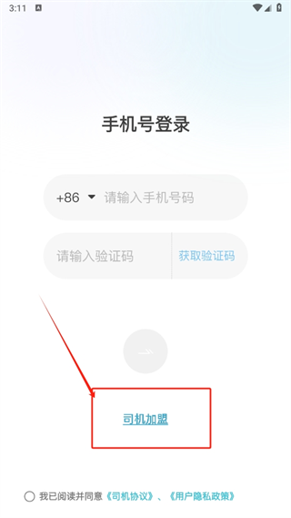3、若你尚未注册成为木丁出行司机,可点击界面下方的“司机加盟”按钮。