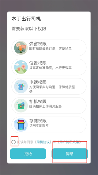 1、首先,点击打开木丁出行司机app。在弹出的权限请求弹窗中,确认位置、电话、相机、存储等权限无误后,勾选同意司机协议和隐私政策,然后点击“同意”继续。