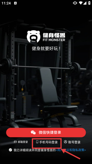 1、打开健身怪兽APP,选择【手机号码登录】进入登录流程。