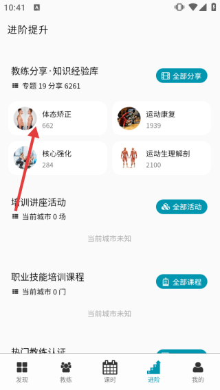 2、在进阶页,选择【体态矫正】等教练分享内容,查看专业知识。
