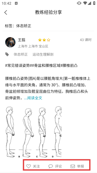 3、进入教练经验分享详情页,可点击【关注】【评论】【举报】与内容互动。