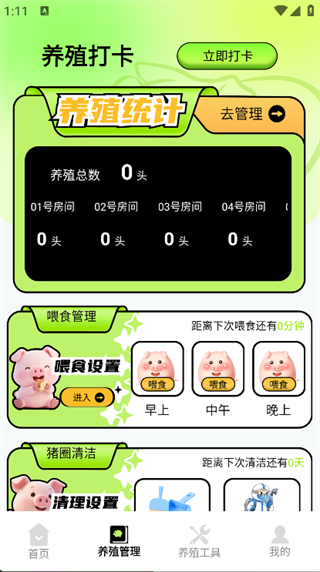 3、点击页面下方的养殖管理,即可查看自己的养殖数据、喂食管理、清理设置等功能。