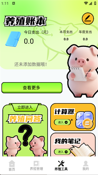4、点击页面下方的养殖工具,即可使用养殖账本、养殖问答、计算器等功能。