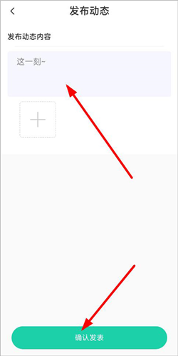 2、进入发布动态页面,输入动态内容,添加照片,点击确认发表即可发布成功。