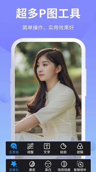 打开App后进入修图页面,可选择去美容、磨皮、美白、贴纸、文字等工具进行细节处理。长按工具图标可查看详细功能介绍和适用场景说明。