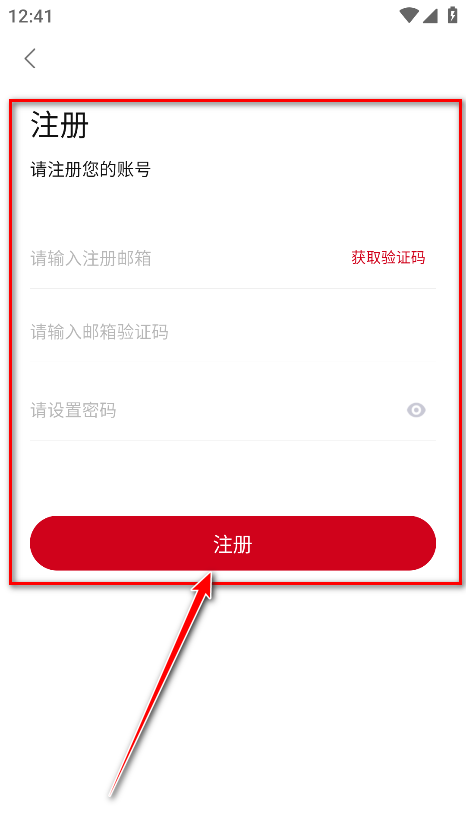 4.请输入邮箱、邮箱验证码、密码,然后点击注册即可。