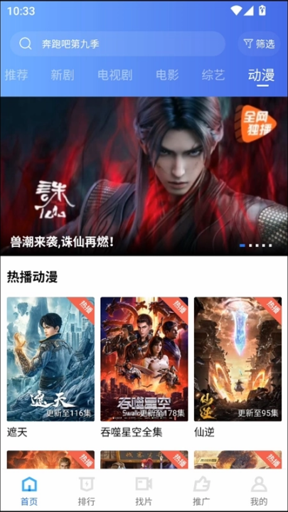 1、在软件首页,我们能够看到推荐、新剧、电视剧、电影、综艺、动漫等一系列板块。