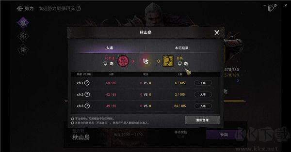 势力战每天9点会正式开打,对战时间只有10分钟,会分多个频道做为场次。玩家可以选择其中一个场次入场,中间也能进行切换,但有较长的冷却时间,推荐就在选好的场次开打就好,前期可以考虑先选我方人多的场次,频道人数上限为190人。