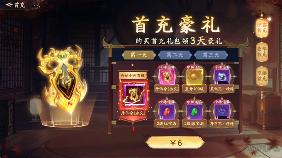 购买首充礼包领3天豪礼。