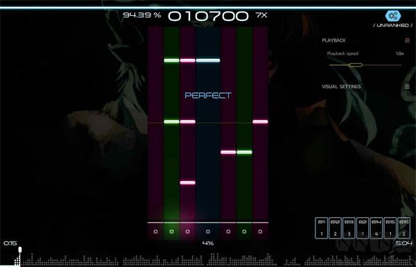 4、弹钢琴:键数从4K到9K可选音符下落击打,单点音符和长按音符需要准确时机和尾判,支持自定义键位。