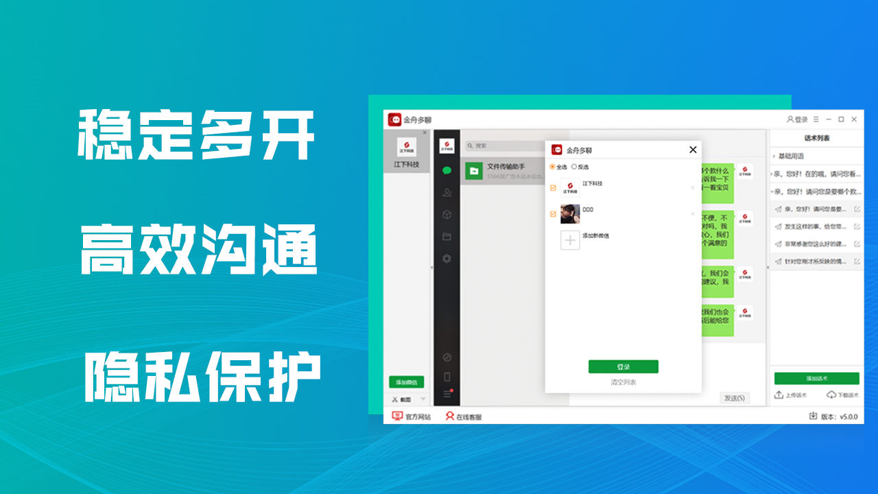金舟多聊微信多开软件是一款简单、易用的微信电脑PC版多开工具,可以同时维护多个微信号,微信消息提醒让管理更加便捷,可以有效提升客服人员沟通效率,帮助企业用更少的客服,服务更多客户。