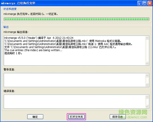 选择需要提取的文件及设置文件名及存储路径之后,点击软件最下方的“开始混流”按钮,软件即开始提取文件,执行完毕之后,可直接通过“打开文件夹”找到提取之后的文件。