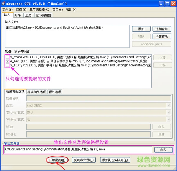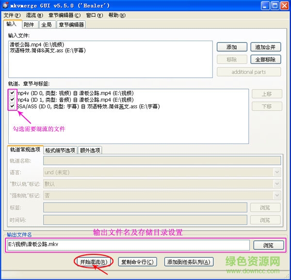 要把字幕添加到视频里面,所以在混流前,需要把视频、音频、字幕都勾选上,然后设置输出文件名即存储目录,即可开始混流。
