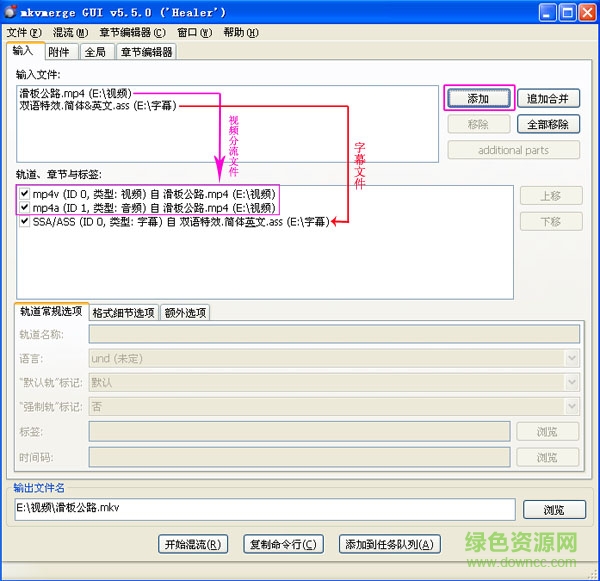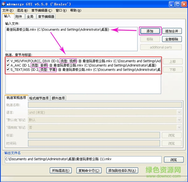 自带的字幕是英文的,在外挂中文以后会很难看的,使用本工具可以把自带的字幕提取出来,更换成中文字幕,字幕格式支持srt,ssa,ass等格式字幕,一般使用的是srt格式字幕,打开软件mmg.exe,选择第一项输入,然后点击添加,找到你要提取字幕的mkv文件,在下面的轨道栏里面会看到mkv里面包含的文件,一般排列方式是视频,音频,字幕文件,音频一般有一个或者几个,要看mkv片源的音轨有几个了,有的时候还会有5音轨,前面的对勾是你要的文件,不要的就不要打钩,你不想要字幕文件的话就不要打钩