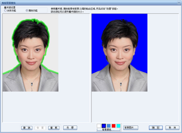 证照之星中的‘智能背景替换’功能可以让我们只要短短几秒钟的时间,就可以实现完美的背景替换!系统已经自动将前景和背景之间的粘合区域给标识出来,我们只要通过魔术擦工具进行简单的修饰就可以了