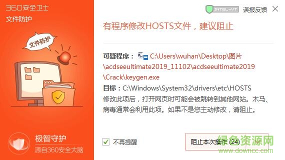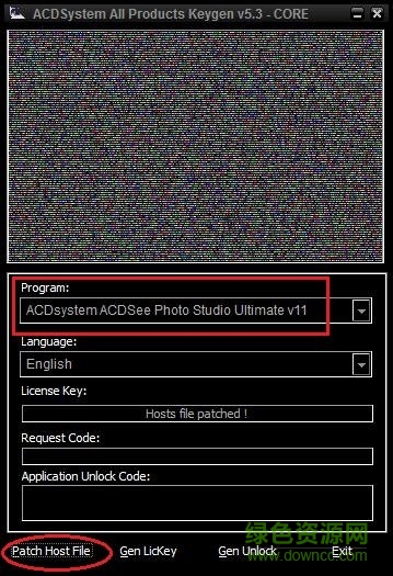 4.注册机“Program”那下拉选择“ACDsystem ACDSee Photo Studio Ultimate v11”,再点击“patch host file”,360安全卫士等杀毒软件会提示修改host,选择运行