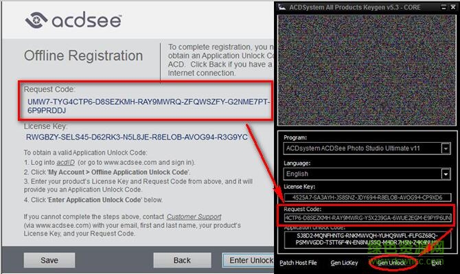 6.上面步骤完成后,软件会生成一个request code,将它复制到注册机对应地方,点击“gen unlock”,会生成激活码