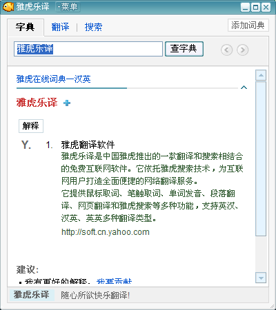 雅虎乐译是一款翻译和搜索相结合的免费互联网桌面绿色软件。它依托强大的雅虎全球搜索技术,给用户提供了全面便捷的搜索翻译功能,雅虎乐译包括鼠标取词、笔触取词、单词发音、个性生词本、段落翻译、网页翻译及雅虎搜索等功能,支持英汉、英英、汉英、网络解释四种翻译类型,并具备智能匹配、拼写纠错的特性。