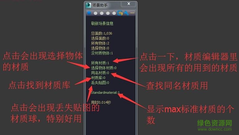 3.材质球数:统计材质总个数,同名材质个数,丢失贴图材质个数。