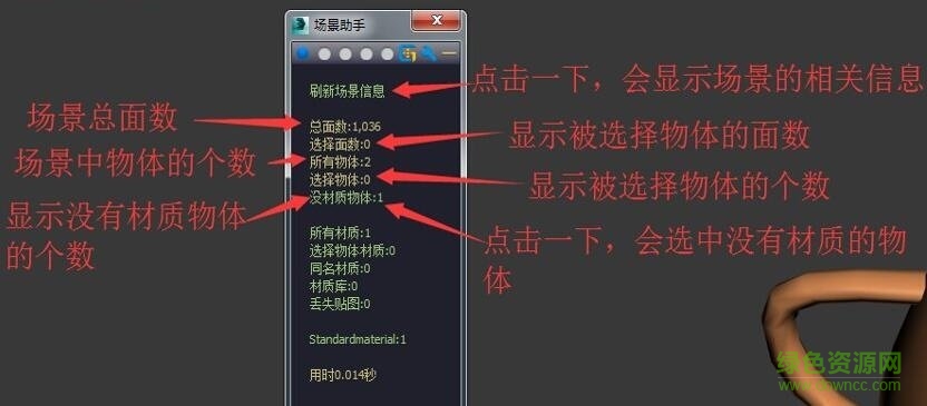 1.物体数量:统计数据包括物体总个数,选择物体个数,没上材质物体个数。