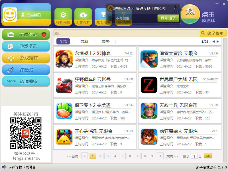 疯子游戏助手里提供了多款热门ios游戏存档,均具有极高的有效度。疯子游戏助手还实现了不越狱装存档、一键装存档、云账号同步存档、教程引导用存档等多种简单的存档使用方式,极大的方便了ios游戏玩家。