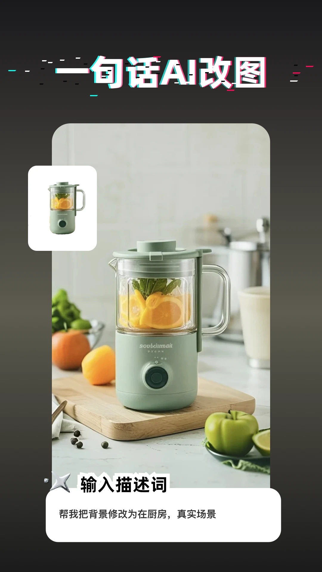 - 一句话改图:输入如 “将背景换成蓝色”“给衣服添加条纹图案” 等自然语言指令,AI 即可快速理解并精准完成改图,涵盖背景替换、色彩调整、元素增减等操作。