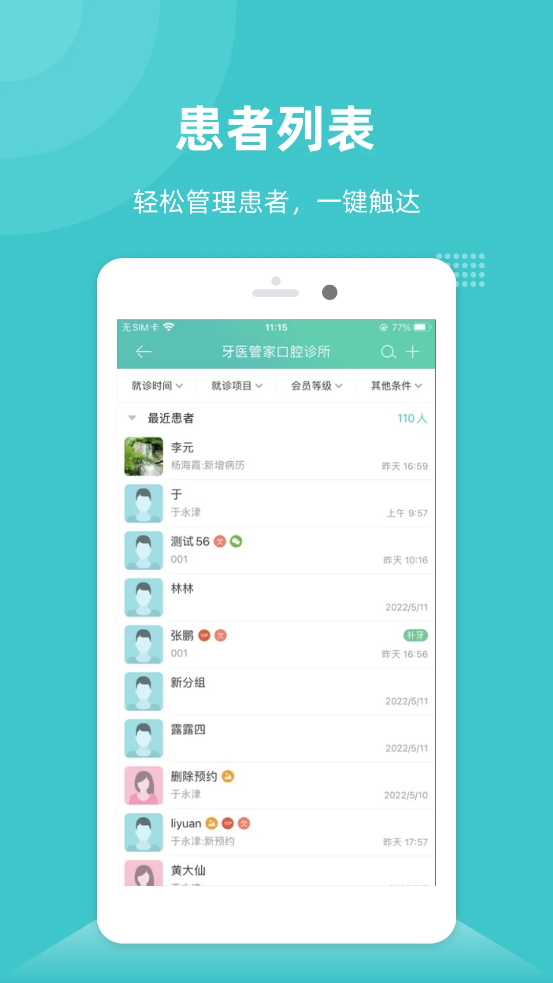 牙医管家APP与牙医管家系统数据云端实时同步,针对患者服务提供完整的患者预约、建档、处置收费、影像、病历、会员管理等基础功能,同时兼顾门诊管理、协同办公、耗材采购及牙医个人的学习成长,真正实现管理无处不在,学习自由自在!