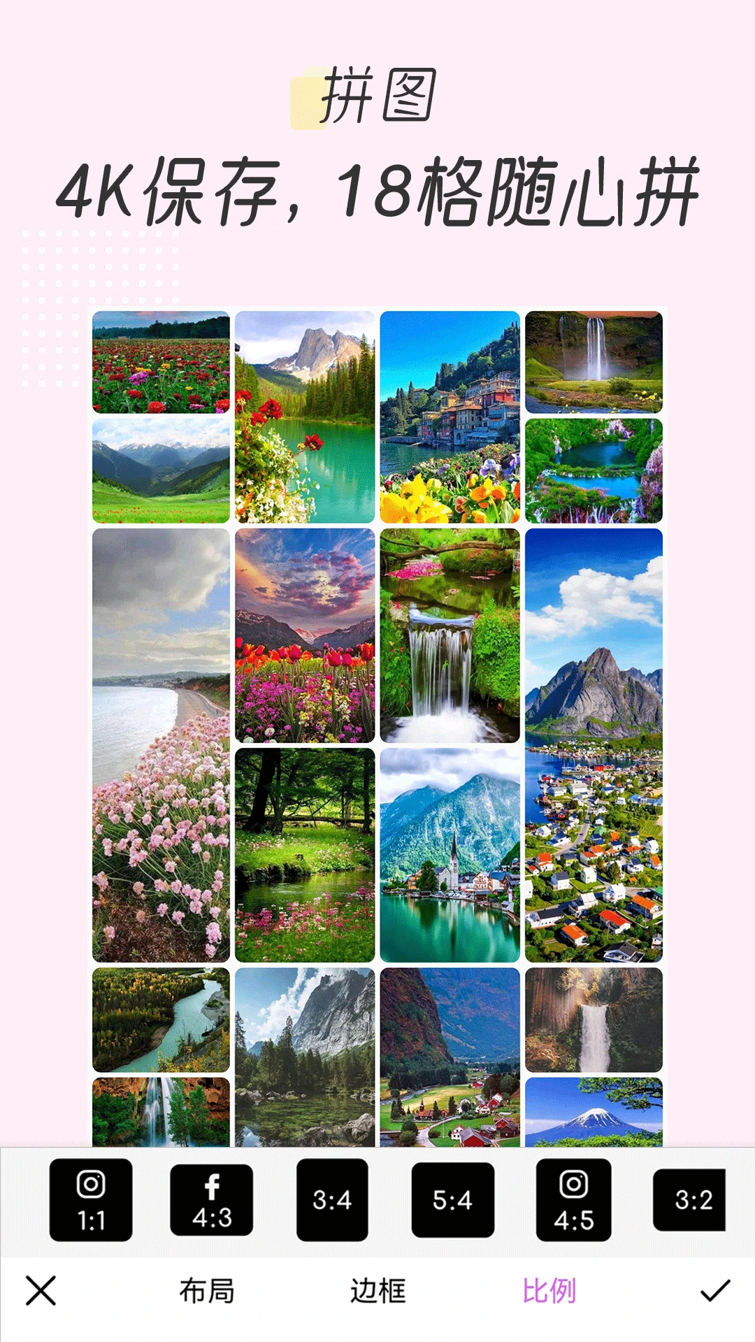 - 4k分辨率,多达18张的照片进行照片拼图