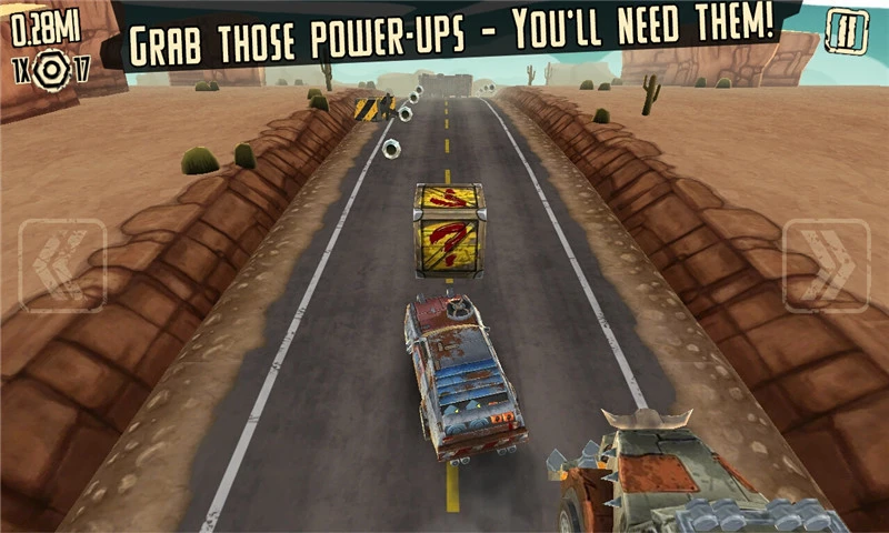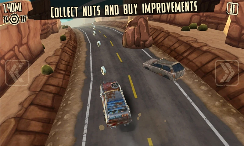 《疯狂道路跑酷 Mad Road Driver》是一款赛车题材跑酷游戏,荒凉的戈壁风景,尽显异域风情。简单的游戏操作,只需玩家触屏点击左右方向键即可控制赛车左右躲避各种来历不明的障碍物。在行驶的过程中,你需要绕过障碍物,收集大量轮胎,来解锁更多的东西。还有丰富的道具助你一臂之力哦。游戏画风不错,只是玩法略微有些单调。