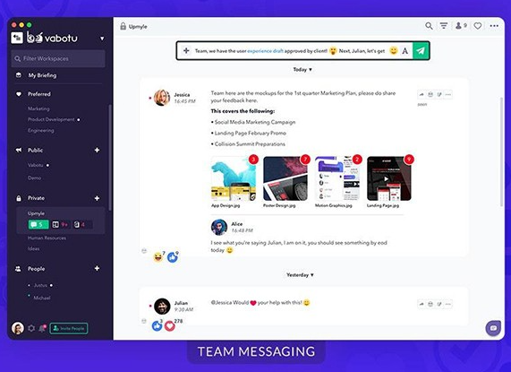 在Vabotu中,对话是在工作空间中进行组织的,您可以将其设为私有或公开。在私人或公共组中或与您的团队进行一对一聊天。