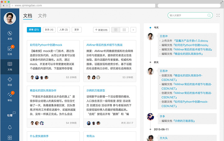 需求分析、版本计划、会议纪要……告别传统的Word模式。与团队成员一起实时的、在线编写。企明岛会详细的记录每个版本的变化,不只是让工作留痕,还可以随时的回到之前的版本。
