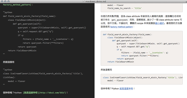 MacDown 乍看之下跟Mou 很像,主要编辑区在左侧,右侧则是预览画面,有需要还可以将左右两侧放大或缩小。使用者只需在左边进行写作,加上Markdown 语法标签,就能在右侧预览区看到即时预览,方便你书写或编辑文件。