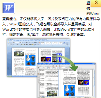 超强的Word兼容能力。不仅能够将文字、图片及表格在内的所有内容原样导入,值得一提的是,飞翔也可以全部导入并且再编辑。对Word文件的样式也可导入编辑,比如Word文件中的流式分栏、锚定对象、脚/尾注、流式拆分表格、OLE对象等。