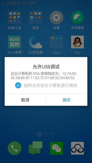 (4)开启后手机端连接电脑后会弹出允许USB调试,勾选上始终允许点击确认。