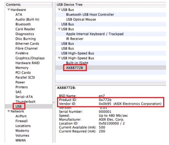 第五步,重启计算机后,接上绿联USB百兆网卡,在Mac OSX 系统的USB栏目即可查看到系统已经识别到了本款绿联USB百兆网卡,如上图所示。