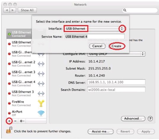 第六步,在Network网络栏目,点击“+”号,增加一个新的网络连接USB Ethernet,如上图所示。点击Apply确定后,在Network网络连接栏目即可看到本USB Ethernet网络连接。