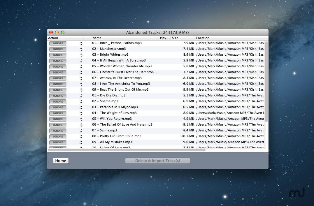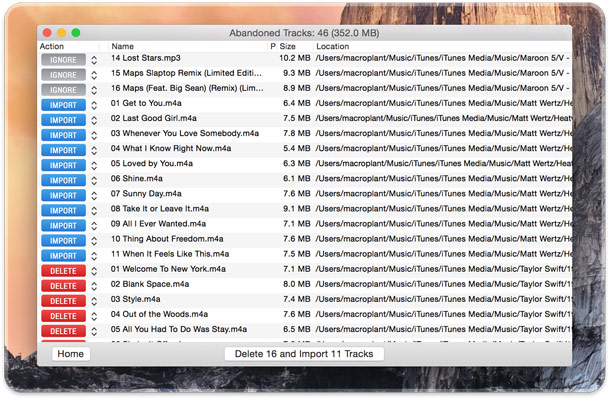 有没有想过有多少曲目在音乐文件夹中存在那些没有出现在iTunes?我们称之为“被遗弃的轨道。”重复数据删除客场检测到这些文件,以便您可将文件恢复到iTunes或恢复磁盘空间是由它浪费了。