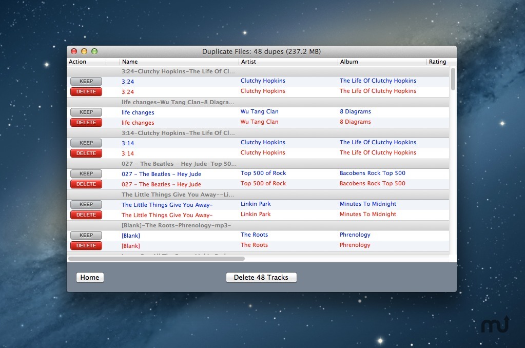 重复数据删除客场适用于Mac和PC的最快,最简单和最强大的iTunes的重复卸妆应用程序。它立即清除重复的曲目,播放列表条目,文件丢失等。