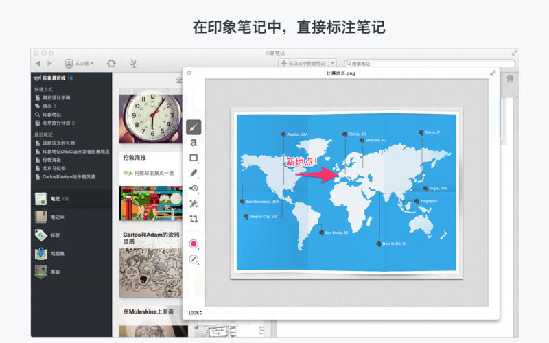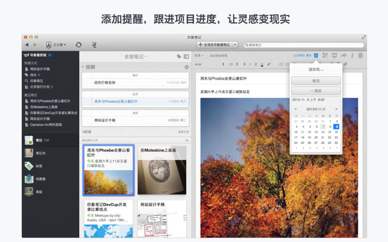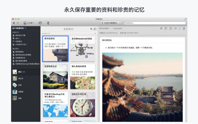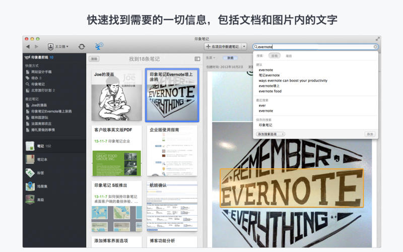 印象笔记mac版是一款目前全球最流行的笔记应用软件,完全免费使用,无限大的存储空间,可以让你永久保存重要的资料和珍贵的记忆!超强的搜索功能,快速找到需要的一切信息,包括文档和图片内的文字,无论你是学习、工作、出差、旅行,都可以使用印象笔记来添加提醒记事。用户还可以在自己的笔记中直接添加标注,让重要内容更明显。