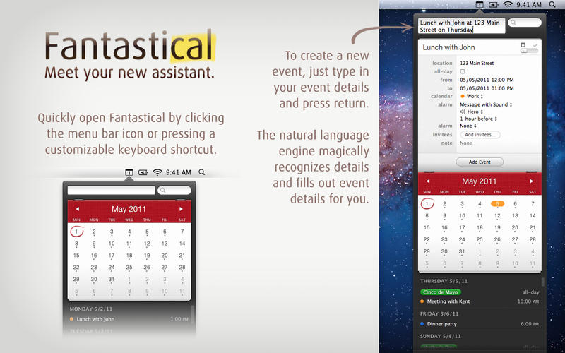 Fantastical Mac版是一款Mac平台上的实用型日历软件,这款日历应用程序使用起来是一种真正的享受。你可以在这款软件中输入并保存一些待办事项,到了固定时间它就会提醒你该做的事情,同时精美的用户界面为你提供万年历,为你带来全新的用户体验。