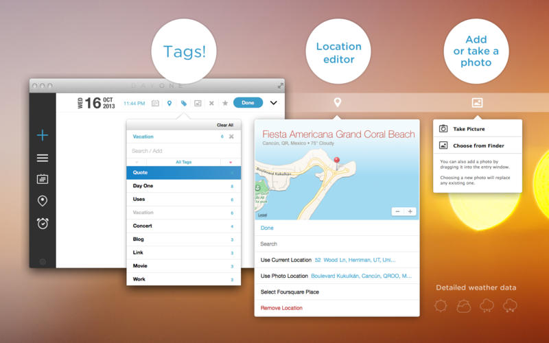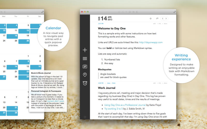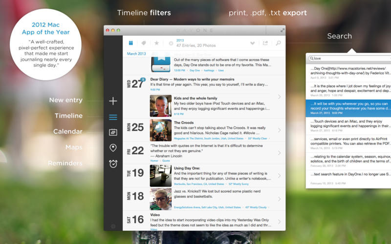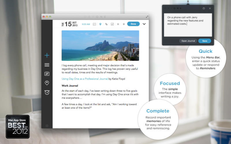 生活点滴,随心而记。无论是婚丧嫁娶之类的大事,还是日常琐事,Day One 的优雅界面都能令记录生活日志成为一件简单快乐的事情,它支持Dropbox的简单备份和同步,会通过快速菜单栏、提醒系统和振奋的语句鼓励你写作,让你时时刻刻都不忘停笔。Day One屡获殊荣,曾于2011 年被评为苹果应用程序商店最佳软件、2012 年 1 月当周最佳软件、2012 年度苹果软件。这款软件简单易用,是微记录的全新方式!