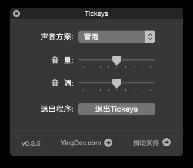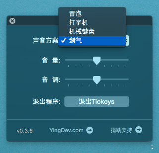 安装 Tickeys 后是没有任何界面的,你需要先依次按下键盘的「QAZ123」才会弹出设置界面。目前 Tickeys 内置了四种不同的声音方案,分别是冒泡、打字机、机械键盘和剑气声,你可以选择一种自己听着舒服的声音,然后调节音量和音调,接着再快速按下多个键盘按键,现在是不是有了不同的键盘音效了,打字起来是不是更有感觉了?
