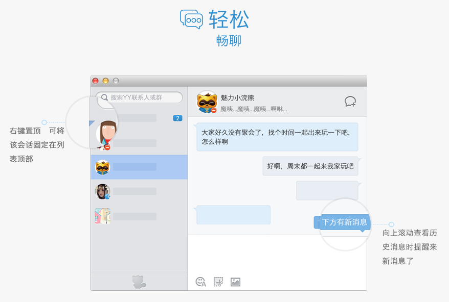 YY Mac版是一款即时语音沟通交流的语音软件,支持运行苹果Mac 10.6以上系统。YY for Mac继承了YY在Windows上的所有功能,为用户提供清晰流畅的语音服务。用户可以使用YY Mac版进行语音聊天、游戏语音、工会语音、网络K歌、多人语聊、团队聊天等使用,功能十分强大,稳定流畅。欢迎下载体验YY Mac版!