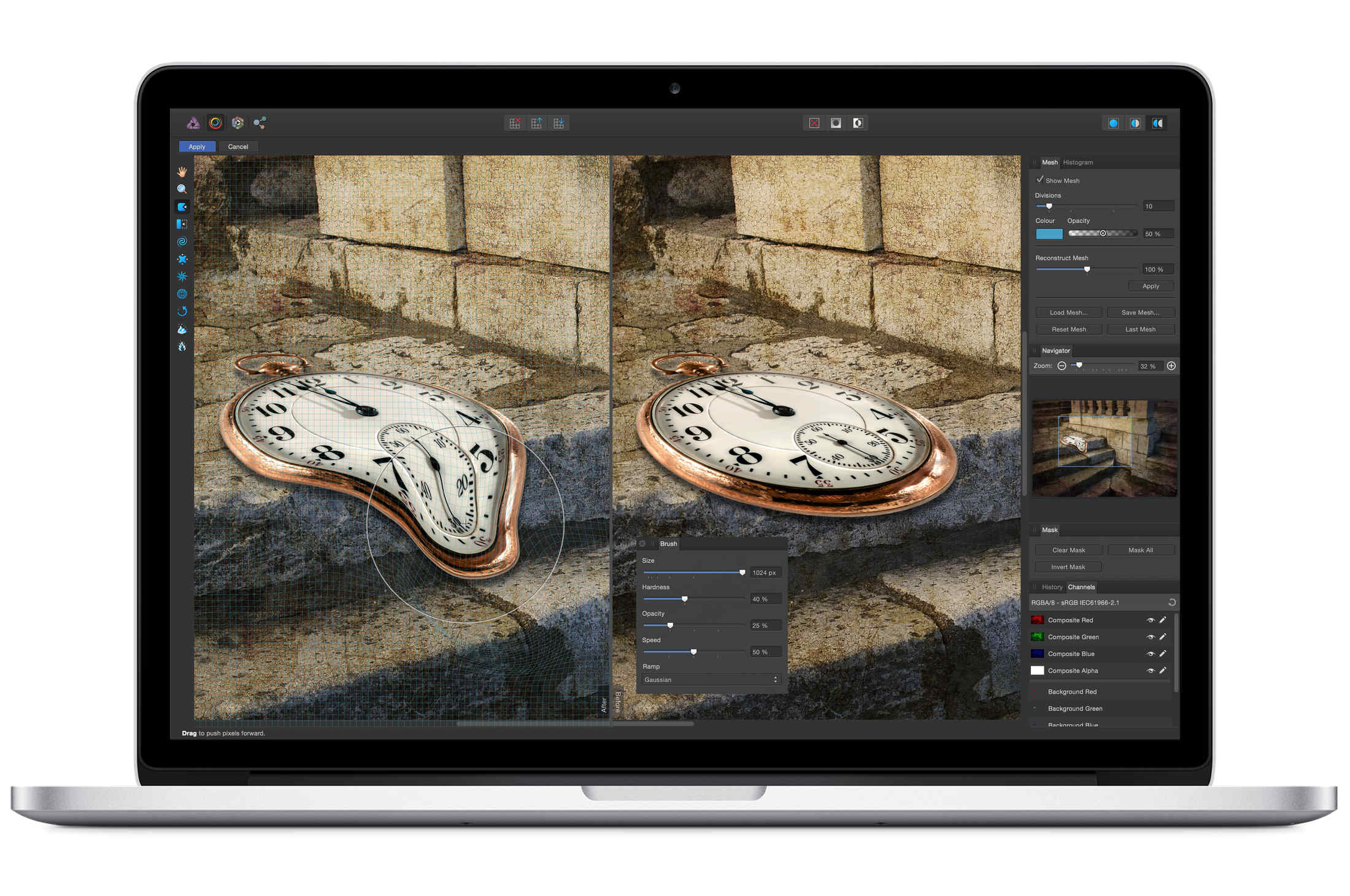 如同Photoshop,Affinity Photo可提供许多专业级的工具应用,像是CMYK色票校正、色彩模式、ICC色彩、16bitsperchannel编辑、Frequency Separation、影像修补等功能,图像编辑与特效呈现可媲美PhotoShop;最重要的是,不仅具备了丰富的专业功能,Affinity Photo更强调其影像处理效能的速度与流畅度是PhotoShop所不能及的。