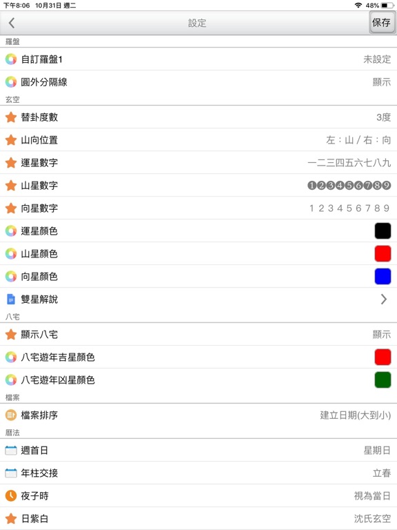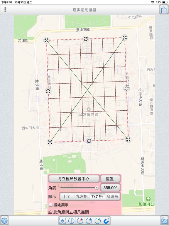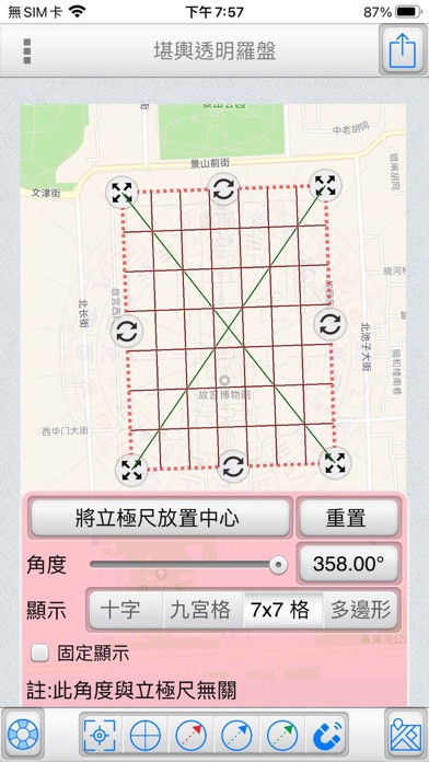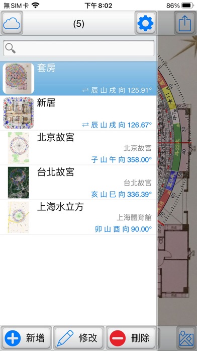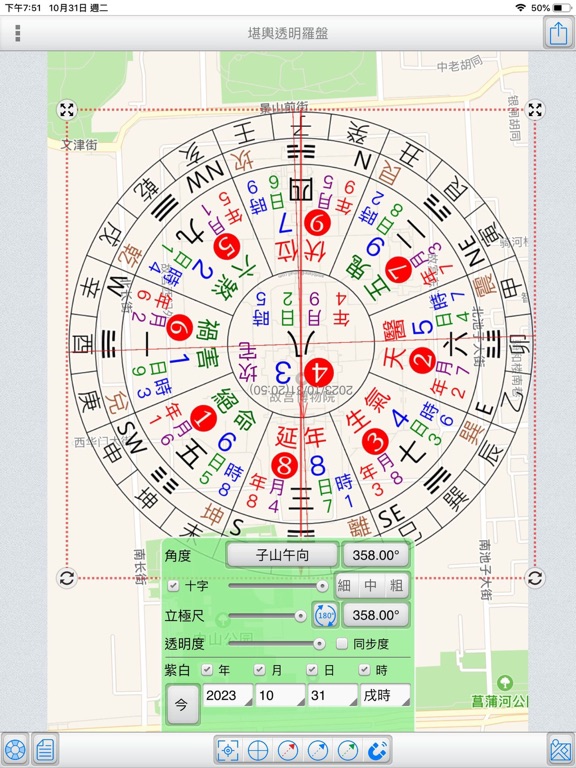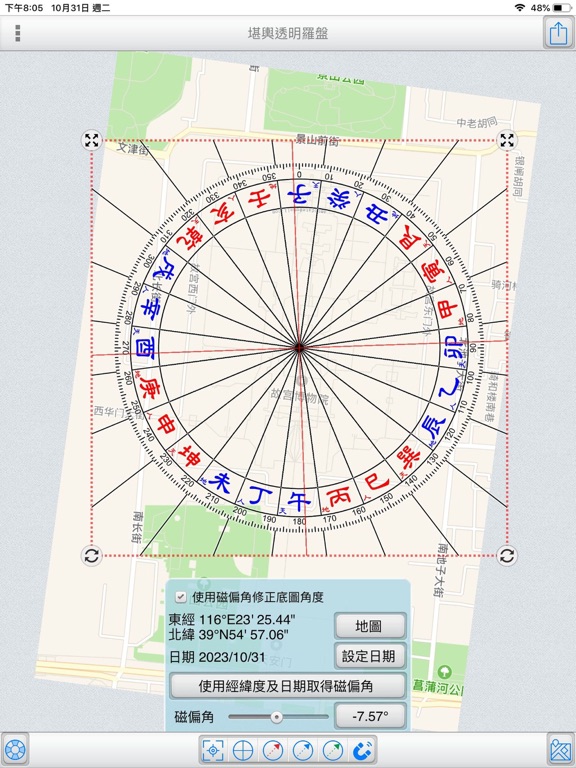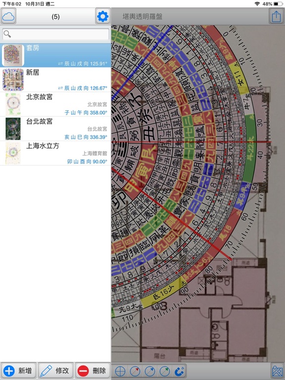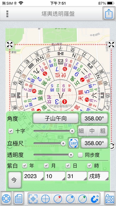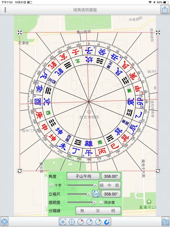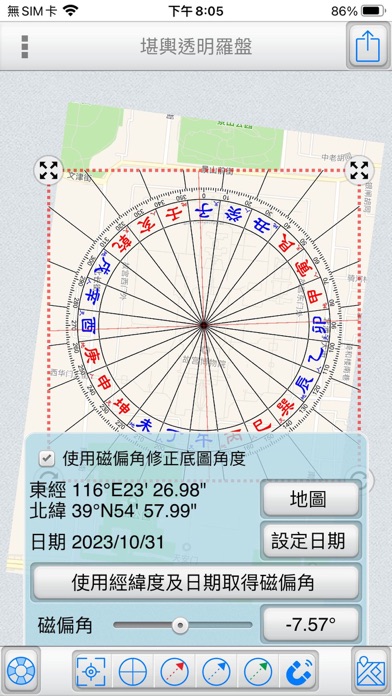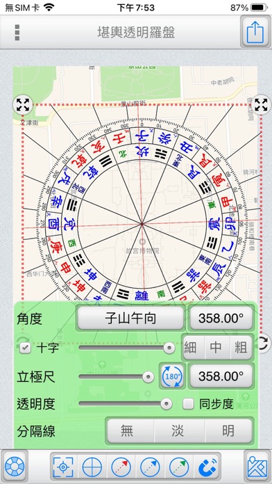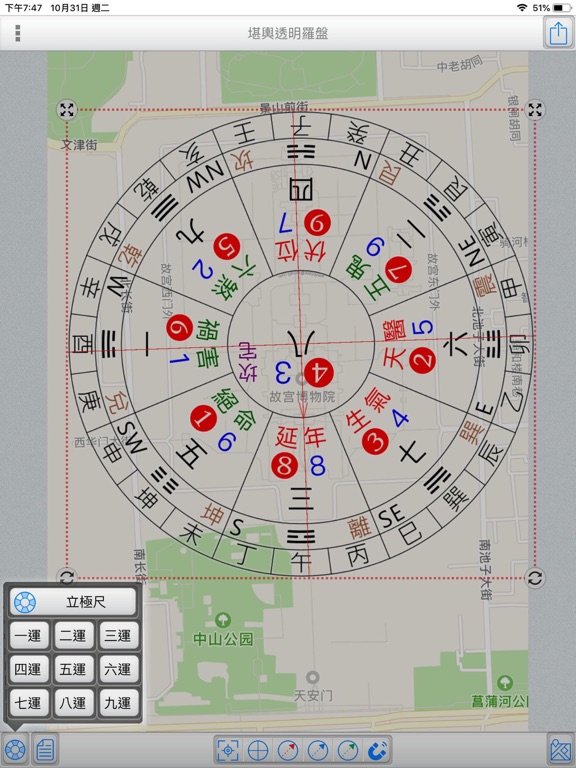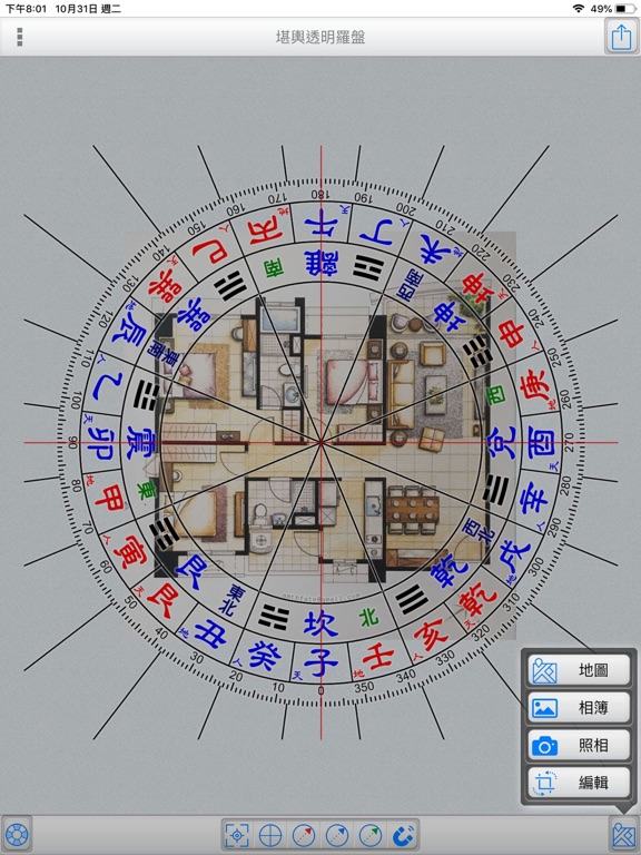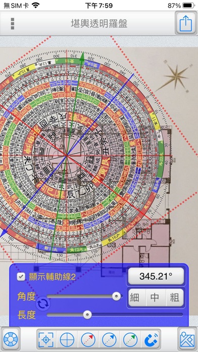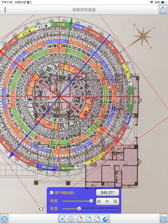 「堪舆透明罗盘」用于「地图」及「房屋建筑平面图」测量方位的工具,提供多种立极尺盘面,就像一个透明罗盘,套在一个图面上,可便测量方位及风水鉴定。 基本操作: 1.新增一个档案。 2.按右下底图按钮,来取得底图。 3.由下方调整「立极尺」及「十字线」度数,去符合底图房子的坐向。 (注:使用地图,方位会自动设定为午山子向,只需调整十字线坐向即可。) 4.移动立极尺,放到想测量的位置。 立极尺盘面提供: ●8格.洛书.卦符.24山 ●8格.24山 ●24格.24山 ●八卦.8格.无刻度 ●八卦.8格 ●12格.12地支 ●玄空盘 ●三元盘.开禧宿度 ●三元盘.时宪宿度 ●三合盘.开禧宿度 ●三合盘.时宪宿度 档案管理:(提供档案管理,缩图预视,轻松管理所有操作过的档案) ●新增档案:请先按「新增」后,再开始立极尺套图操作。 ●修改档案:修改档案的项目名称。 ●删除档案:选取某一个档案后,再按「删除」来删除该档案。 ●档案列表:提供实际套图的缩图、项目名称、地址(可用于查找地图)、坐向、坐度等资讯。 ●快速搜寻:于上方搜寻栏输入文字,即找出项目名称、地址内含该文字的档案。 ●提供 Google 云端备份及由 Google 恢复资料功能(备份包含套图档案及设定)。 ●提供 iCloud 云端备份及由 iCloud 恢复资料功能(备份包含套图档案及设定)。 底图: ●地图:撷取地图,当成底图,可显示:正常、卫星、混合,三种模式,可输入地址查找(可记录在目前档案内)。 ●相簿:由相簿来选取相片,当成底图。 ●照相:透过照相功能,拍照后当成底图。 ●编辑:可编辑剪裁及旋转底图。 中心定位: ●用途:提供测量底图某个区域的中心位置。 ●样式:提供「十字、九宫格、7x7 格、多边形」四种样式。 ●固定显示:勾选保持一直显示,并可将状态记录存档。 ●操作方法如下: ●将距形放置并贴齐在底图的某个区域。 ●可任意张缩及旋转的距形。 ●按「将立极尺放置中心」可将立极尺放置中心位置。 ●注:这里旋转角度与立极尺无关,旋转主要目的是贴齐底图。 ●多边形操作方法: ●拉动红色圆点去贴齐测量的区域! ●手指点在线上,再拉动,可新增点。 ●中间蓝色圆点为多边形的中心点。 立极尺: ●调整「立极尺」及「十字线」度数,去符合底图房子的坐向。 (注:使用地图,方位会自动设定为午山子向,只需调整十字线坐向即可。) ●皆提供输入坐度及滑动条来调整坐度。 ●同步度: ●地图为底图:不会勾选同步,因为地图固定为午山子向,只需调整十字线坐向符合房子坐向即可。 ●相片为底图:自动勾选同步,当底图下方为坐山,上方为向山,同步调整即可。 (例外时,可不勾同步度,分开调整) ●透明度:可依底图颜色的深浅,调整立极尺的透明度。 ●十字线:显示或不显示十字线。 ●手势操作: ●单指点一下立极尺,可看到立极尺四个角落按钮: ●按住立极尺之左上角,右上角,来缩放及旋转立极尺。 ●按住立极尺之左下角,右下角,来缩放立极尺(如果不想动到坐度,请用此按钮)。 ●二指缩放大小。 ●可将套图分享到:云端列印、微信、Line、Messenger、相簿...等(视机子分享项目而定)。 双星解说: ●当选用一~九运玄空飞星盘时,可点九宫方位,显示双星解说内容(可由设定内编辑解说内容)。 辅助线: ●提供3条辅助线,红、蓝、绿三种颜色。 ●点下方辅助线功能,即可显示该辅助线,如不想显示,请将勾取消即可。 ●辅助线度数操作: 1.由立极尺内,按住不放来转动辅助线的度数。 2.由下方度数按钮,输入度数。 3.由下方滑动条,来调整度数。 磁偏角: ●可指定经纬度及日期,由 NOAA 网站取得磁偏角,亦可手动输入磁偏角。 ●可应用磁偏角修正底图的角度。 偏好设定: ●自订罗盘:可指定罗盘图档下载网址。 ●圆外分隔线:立极尺分隔线有超出圆外部份,可设定是否显示。 ●替卦度数:可设定不替卦, 或 3 度容许替卦。 ●山向位置:山向的左右位置设定。 ●运星数字:运星显示数字符号。 ●山星数字:山星显示数字符号。 ●向星数字:向星显示数字符号。 ●运星颜色:运星显示颜色。 ●山星颜色:山星显示颜色。 ●向星颜色:向星显示颜色。 ●双星解说:可自订编辑玄空飞星双星解说内容。 ●显示八宅:设定是否显示八宅。 ●八宅游年吉星颜色:吉星显示颜色。 ●八宅游年凶星颜色:凶星显示颜色。 ●档案排序: 可依名称或建立期排序。 ●周首日:设定一周开始的星期。 ●年柱交接:设定年柱节气的交接点。 ●夜子时:提供夜子时设定。 ●日紫白:提供五种排法 ●时紫白:提供三种排法 ●语言地区:可随时切换介面语言,提供繁体中文、简体中文、日文、英文。 ●介面字体:提供字体大小调整。 ●底图最小比例:100% 为萤幕大小,50% 为萤幕大小的一半(可用于立极尺有需要拉伸比底图大时)。 ●使用网页地图(google/百度):设定是否使用网页地图。 ●萤幕锁定:不锁定可长时间使用,萤幕不会关闭。 ●全萤幕:开启或关闭全萤幕。 ● 本工具仅为风水鉴定之辅助工具,使用者需具备风水相关知识。 ● 操作介面:繁体中文、简体中文、日文、英文。 ● 同时支援平板大萤幕任意方向显示。+新增地图可勾选是否显示当前位置点