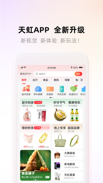 天虹APP是天虹数科商业股份有限公司为顾客量身打造的一款创新型APP,融消费和服务于一体,为大家带来全新的购物体验。 凭借不断的创新和长久以来对品质的不懈追求,天虹连续多年荣获CCFA零售创新大奖、2017-2018年度电子商务示范企业、2019年荣获中国电子商务年度评选“年度转型企业”称号。天虹APP团队也于2017年荣获中国零售创新团队大奖。 --这样购物才够酷-- 【手机快速买单】 超市买单不排队?这种黑科技在天虹你就可以体验到啦!使用天虹APP边逛边扫码,一键核验,就是这么酷炫~是时候换种姿势买单啦~ 【天虹到家】 没空逛超市?天虹超市直达到家,快捷方便,谁说在家不能逛超市? 【停车缴费】 进出天虹停车场,无需取卡,无需备零钱,手机一键缴费,天虹会员还有专属优惠呦~ 【购物卡付款】 绑定天虹购物卡,在超市百货便利店买单直接出示付款二维码支付,再也不用携带购物卡。还能实时掌握购物卡余额,个人积分,交易明细情况等,购物更轻松。 【拍小票积分】 用户在商户消费后,使用天虹APP的拍小票积分功能,将小票完成拍摄并快速上传,审核通过后积分返还至用户APP账户,可用于天虹购物、停车抵扣现金、积分商城等。 --甄选品质有保障-- 【海外购】 我们严把质量关,精挑细选丰富的品质好物,全世界的美好生活从这里开始。 【数字化专柜】 与品牌商联手打造全渠道专柜,将百货专柜延展到线上,在门店挑不到喜欢的?喜欢的鞋子却断码?调货太麻烦?试试数字化专柜,这才是真正的专柜同款。 --一站式服务体验-- 【生活】 洗衣、洗家电、买电影票、代收快递......一个APP就能搞定~(≧▽≦)/~,你只需负责貌美如花就好啦。 【积分】 会员积分可以进行停车缴费,兑换商品,还能直接进行线下买单支付,小积分大用途。 --售后服务有保障-- 【极速退】 实体门店购物线上就能退,快递上门取件,金卡铂金卡限额内极速退,退货发出,退款即到。 使用中如果有任何问题,以下方式联系我们: 官方微博:天虹官方APP 官方微信:天虹(rainbow-cn) 客服电话:4008-295-295 客服小天时时在你身边!【会员权益】 会员中心3.0全新改版,会员权益在线领取/查看,一目了然,会员体验升级 修复兼容性问题,更多细节惊喜功能,我们等您来体验和分享声音! 好价易得,好物更近 天虹11.11狂欢盛宴开启!