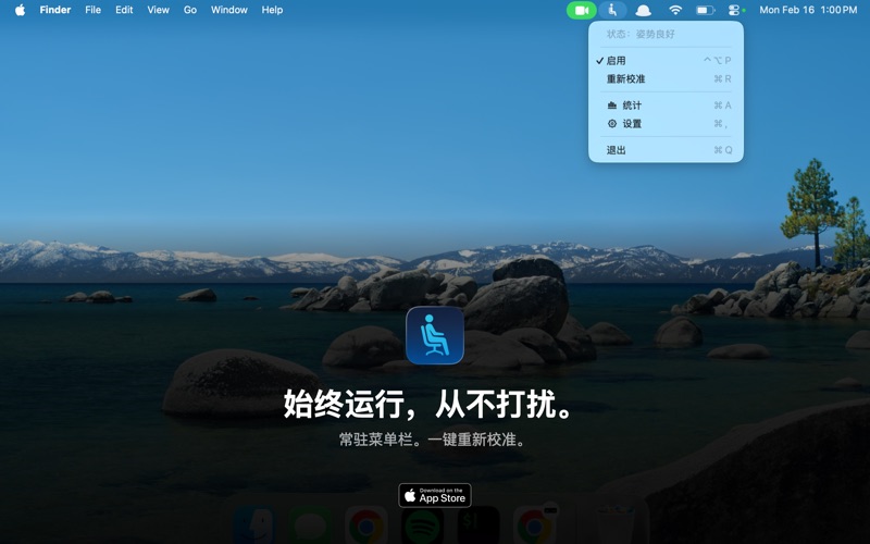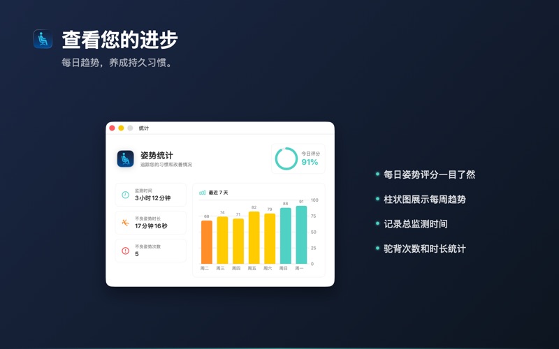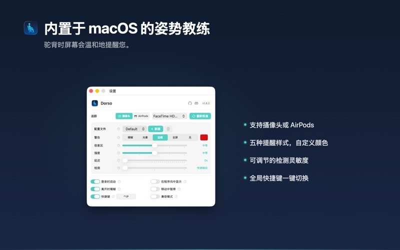 Dorso 会在您驼背时模糊屏幕 - 帮助您养成更好的习惯,而不会打断您的专注力。 两种追踪方式 • 使用 Mac 摄像头进行精确的面部检测 • 或使用 AirPods Pro/Max 运动传感器 - 无需摄像头 选择您的提醒样式 • 模糊 - 随驼背严重程度增加的渐进式屏幕模糊 • 辉光 - 从屏幕边缘发出的微妙红光 • 边框 - 显示器周围的彩色边框 • 实色 - 全屏颜色覆盖以获得最大可见性 • 或禁用视觉警告,仅跟踪您的统计数据 智能功能 • 检测驼背和"乌龟颈"前倾姿势 • 分析仪表板跟踪您的姿势评分和随时间的改善情况 • 离开时模糊 - 当您离开时自动遮蔽屏幕 • 全局键盘快捷键可快速暂停监测 • 适用于所有连接的显示器 隐私优先 所有处理都在您的设备上本地进行。无需账户,不收集数据,无云连接。 非常适合远程工作者、开发人员以及长时间使用电脑的任何人。 Dorso 1.11.1 新增自动追踪、AirPods 4 支持及稳定性改进。 - 自动追踪模式: Dorso 根据可用性自动在摄像头和 AirPods 之间切换,优先使用您偏好的来源 - 现已支持检测带主动降噪功能的 AirPods 4 - 菜单栏新增支持选项 - 改进了 AirPods 校准和动作检测的可靠性 - 错误修复和翻译改进