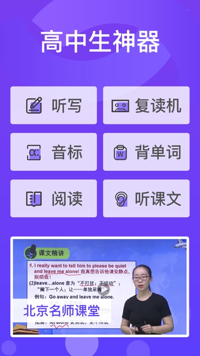 高中英语名师讲解同步教材知识点,同步课文、单词、音标、录音以及听力口语训练。 【课程全面】课程包含了高中英语各章节内容的知识点总结。“辅导资料”、“作文素材”、“同步练习题”。 【资深名师】资深授课老师,独特的教学方法,帮助学生摆脱升学考试的烦恼。 【同步课堂】“视频同步课程学习,同步课堂线上支持人教版,北师大版,外研版等其他版本。 【年级讲解】年级课程目录随意切换,讲解重点突出。 【音标学习】系统学习英语国际音标,帮助学生改善英文发音。 【分类练习】课外扩展学习听力、口语、语法等知识,让孩子全面发展。修复已知问题。